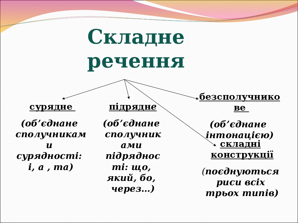 Складні речення поділяються на складносурядні, складнопідрядні, складні безсполучникові і складні конструкції. У складносурядному реченні частини, що мають свої синтаксичні центри, відносно рівноправні. Вони поєднуються між собою сполучниками сурядності і, та, а, але, проте, зате, однак, все ж, або, чи (=або), або...або, чи...чи, то...то.